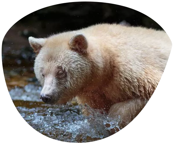 Spirit bears are among the world’s rarest bears, found only in and around areas of the Great Bear Rainforest in BC. Long present in First Nations traditional song, dance, and storytelling, Indigenous peoples once kept these bears a secret in order to protect them from fur traders. They are not albino bears – they are a subspecies of the black bear with a rare, recessive gene causing their white or cream colouring. This recessive gene is incredibly rare in black bear populations, and efforts are being made to protect Spirit Bears accordingly.